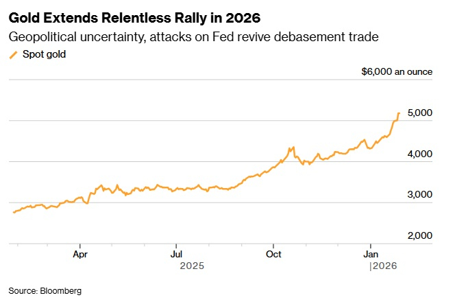 周三(1月27日)亚市盘中,现货黄金价格突然再度加速攀升,金价突破5200美元/盎司大关,创下历史新高,延续了由美元疲软以及从主权债券和货币逃离所推动的急速上涨。